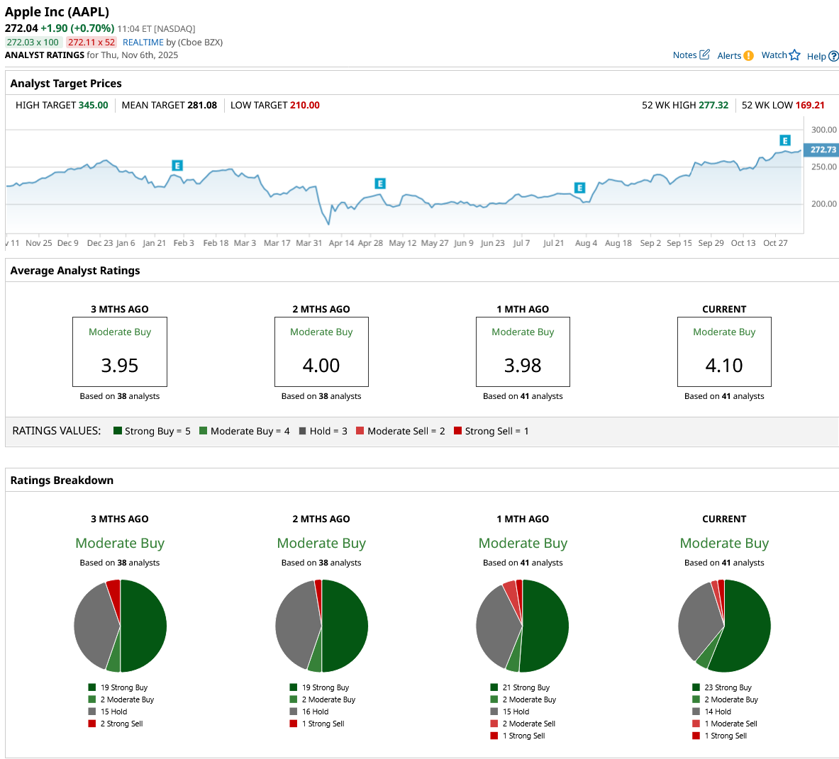 On Wall Street, AAPL stock is rated a consensus “Moderate Buy.” Of the 41 analysts covering it, 23 recommend a “Strong Buy,” two rate it a “Moderate Buy,” 14 suggest a “Hold,” one suggests a “Moderate Sell,” and one more says it is a “Strong Sell.” With an average price target of $281.08, analysts project a potential upside of around 3.3% from current levels. The highest price target of $345 suggests the stock could rise as much as 27% from current levels.