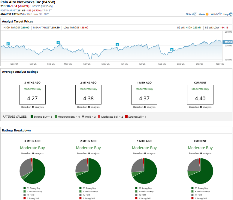 Among the 48 analysts covering the PANW stock, the consensus rating is a “Moderate Buy.” That’s based on 33 “Strong Buys,” three “Moderate Buys,” 11 “Holds,” and one “Strong Sell.”