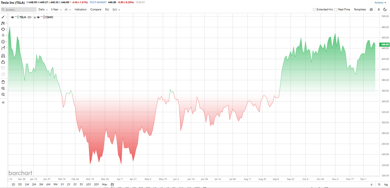 Overall, Tesla's consensus rating is “Hold” by 41 analysts tracked by Barchart. The average 12-month price target sits at $386.29, which is well below Tesla's current price. However, the Street high target of $600 suggests 35% upside potential.