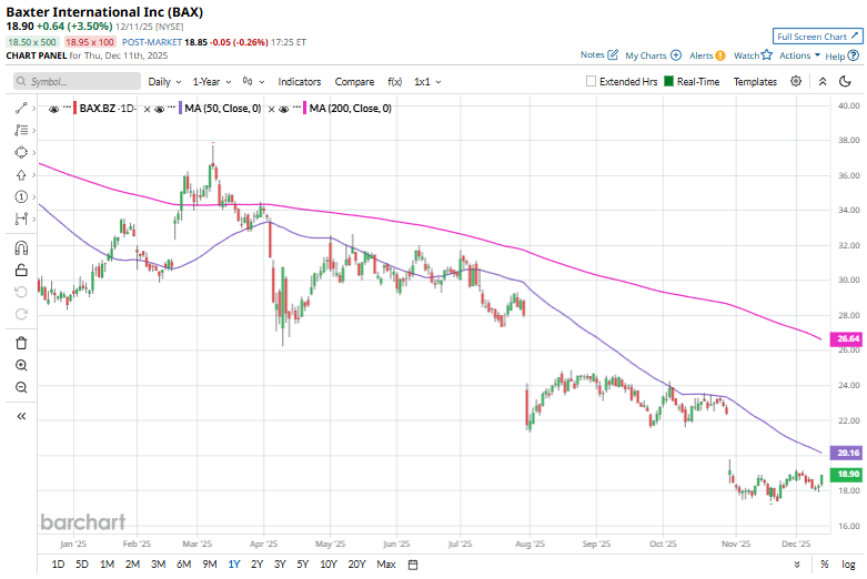 With a market cap of $9.4 billion, Baxter International Inc. (BAX) is a global medical technology company specializing in essential hospital products and therapies used in intensive care, kidney care, pharmaceuticals, and surgical settings. Headquartered in Deerfield, Illinois, its portfolio spans infusion systems, dialysis equipment, sterile IV solutions, and advanced patient monitoring technologies.