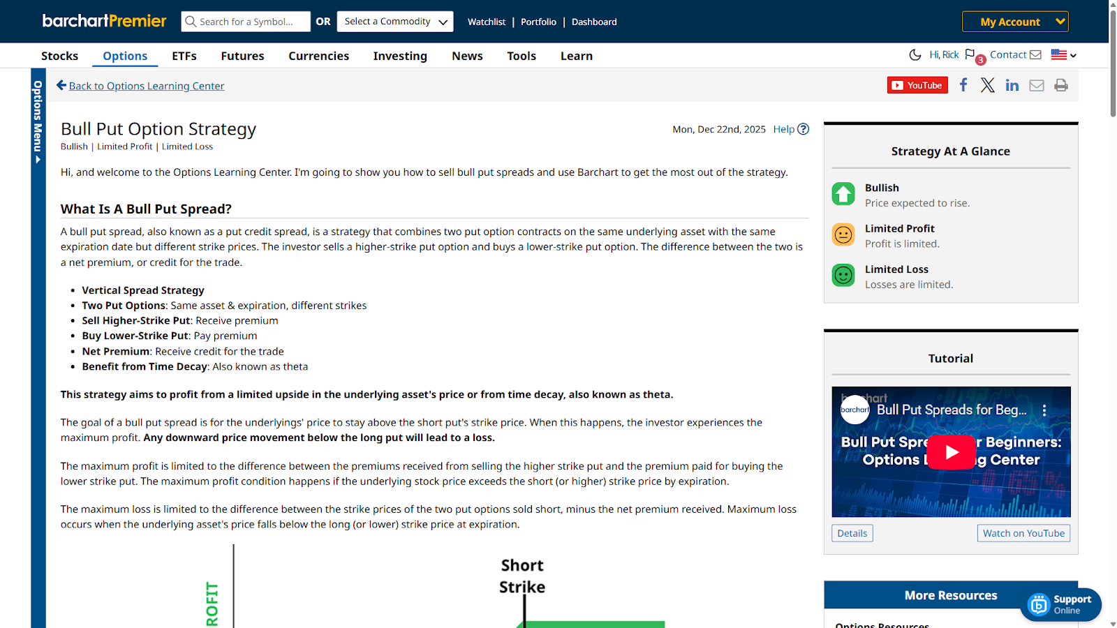 Bull put spreads are used during neutral or moderately bullish market conditions. The goal is for the stock or ETF to trade above the short strike price at expiration. That’s why short strikes are usually below the current trading price right at the start of the trade.