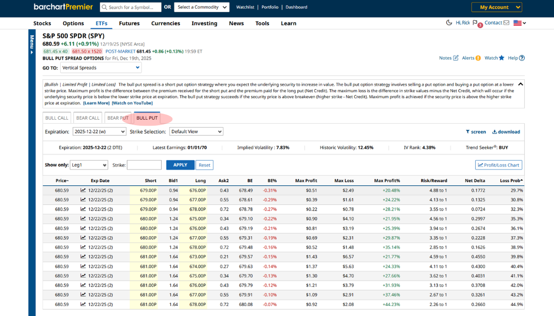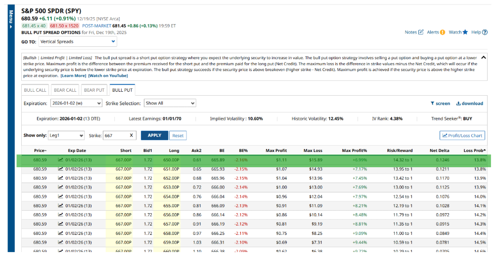 Since you’re aiming to capitalize on the Santa Claus rally, you’d want to choose trades that expire close to the second trading day of 2026, which is January 3, 2026. There are weekly bull puts that will expire on January 2, so I’ll use that date.