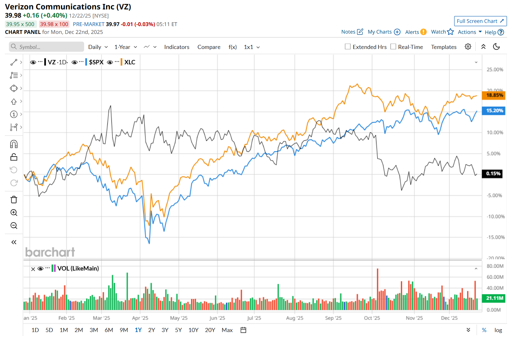 Shares of VZ have gained marginally over the past 52 weeks, considerably lagging behind both the S&P 500 Index's ($SPX) 16% return and the State Street Communication Services Select Sector SPDR ETF’s (XLC) 19.1% uptick over the same time period.