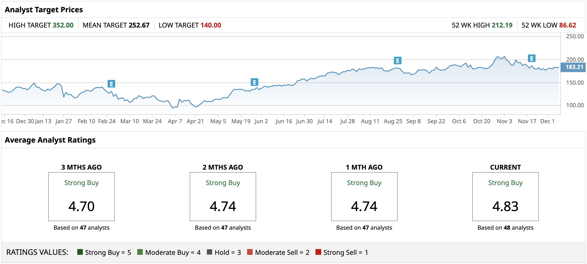The average price target is $252.67 (37.7% upside), with the highest price target all the way up to $352. The lone "Sell" rating gives you a $140 price target, which still isn't that bad.