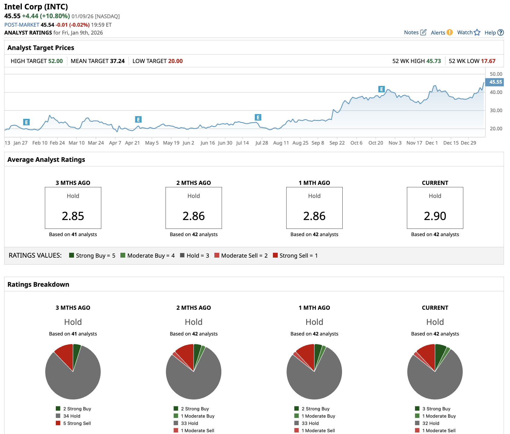 Out of the 42 analysts covering INTC stock, three recommend “Strong Buy,” one recommends “Moderate Buy,” 32 recommend “Hold,” one recommends “Moderate Sell,” and five recommend “Strong Sell.” The average Intel stock price target is $37, below the current price of $45.