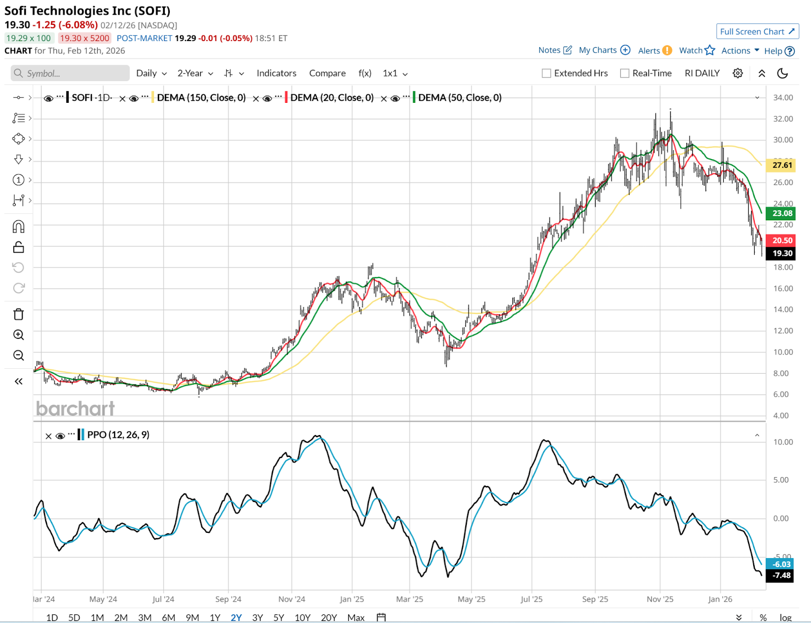 SoFi (SOFI): Easily the worst of the bunch, currently. This chart has $10 written all over it. The Percentage Price Oscillator (PPO) is in worse shape than it has been at any point in this most recent descent. Translation: sellers are piling on, and rallies are being sold. Hard.