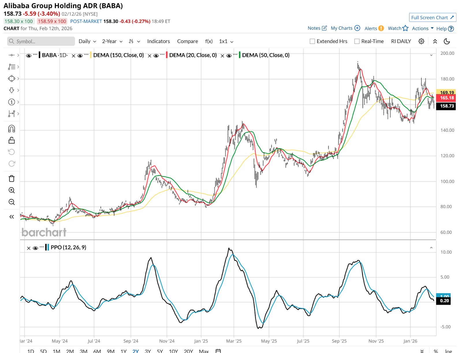 Alibaba (BABA): Chart is leaking, $120 is a potential target. Chinese stocks’ latest rally was the typical 50% in a flash, then a skittish few months. Look at the chart to see how this has become routine for Alibaba. That makes it a good candidate for both leveraged long and short ETFs.