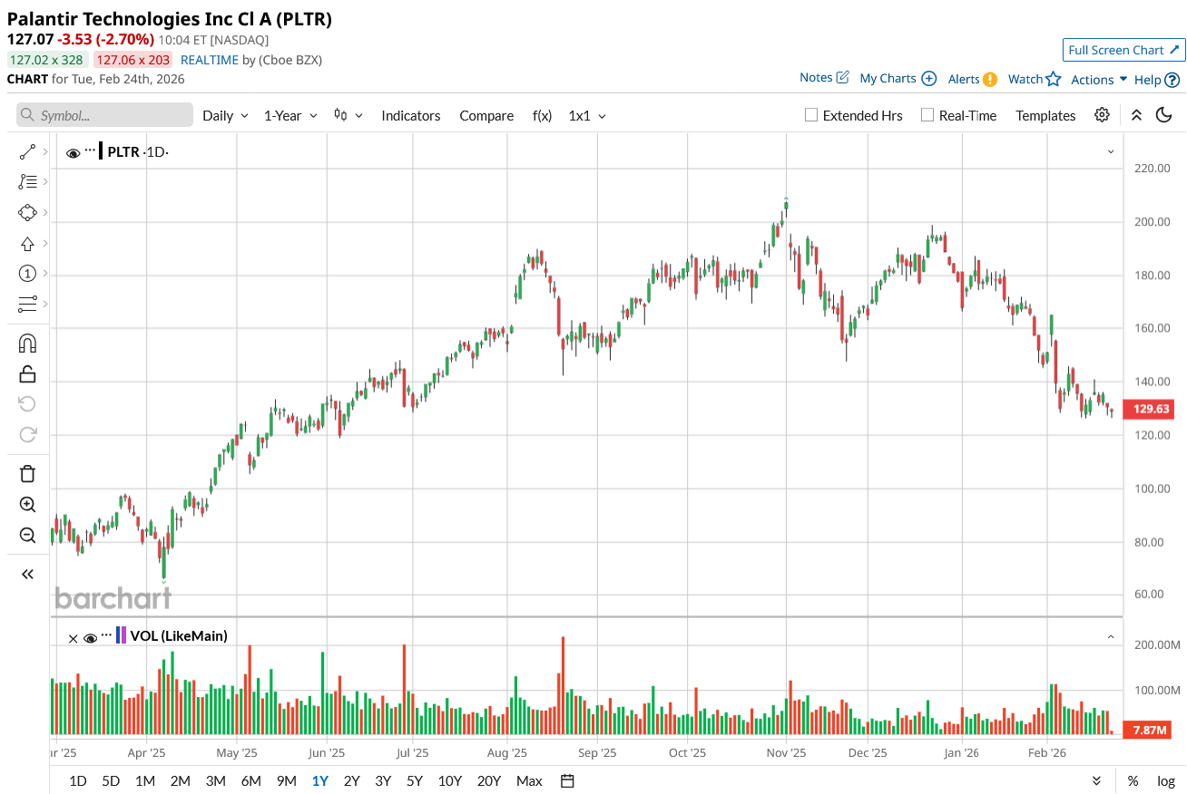 After a blockbuster performance in 2025, shares of the analytics software provider have slumped 27% so far this year. PLTR stock has been caught up in the recent software-sector selloff and the broader deterioration in sentiment toward AI. Concerns that the company’s valuation had outpaced its fundamentals also weighed on the stock.