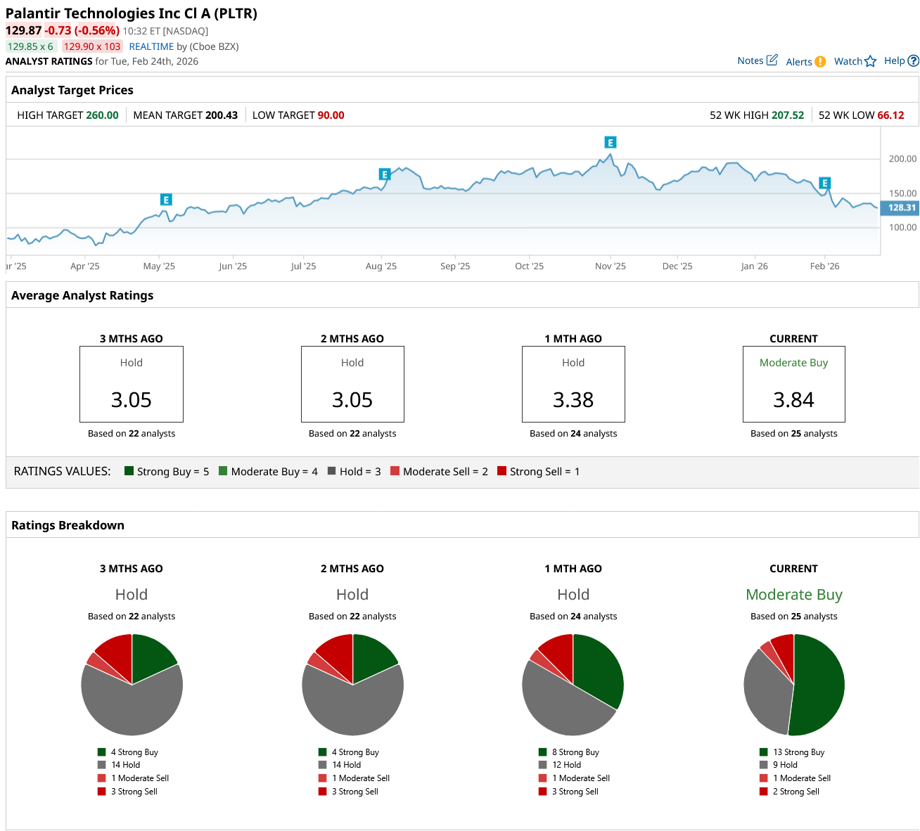 The broader Wall Street community seems to share Mizuho’s Moskowitz’s view, as reflected in the stock’s “Moderate Buy” consensus rating. Interestingly, PLTR stock had a “Hold” consensus rating just a month ago, suggesting that the recent pullback, combined with strong growth prospects, is prompting more analysts to turn bullish. Among the 25 analysts covering the stock, 13 assign a “Strong Buy” rating, nine recommend holding it, one rates it a “Moderate Sell,” and two have issued a “Strong Sell” rating. The mean price target for PLTR stock stands at $200.43, implying 48.2% upside potential from Friday’s closing price.