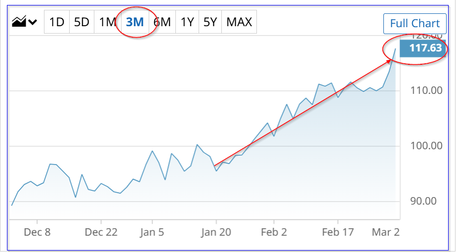 COP is at $117.03, up $3.54 (+3.2%) today, up $15.24 (+15%) from $101.79 from Feb. 2. As it stands, COP stock now has a 2.87% annual dividend yield.