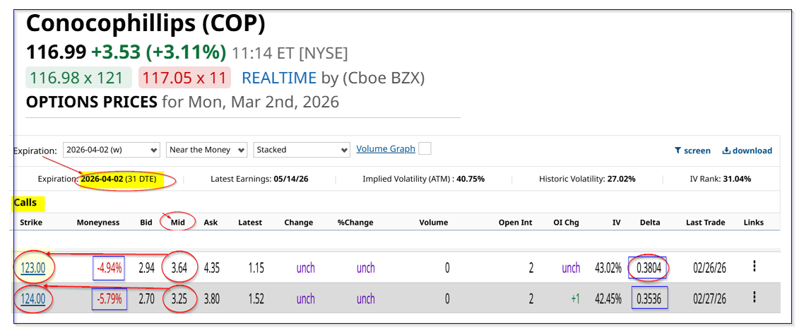 ConocoPhillips (COP) stock is up over 3.0% today due to the Iran war turmoil. It could be time for existing shareholders to sell out-of-the-money (OTM) covered call options, given the 2.48% one-month yield for 5.5% higher strike prices.