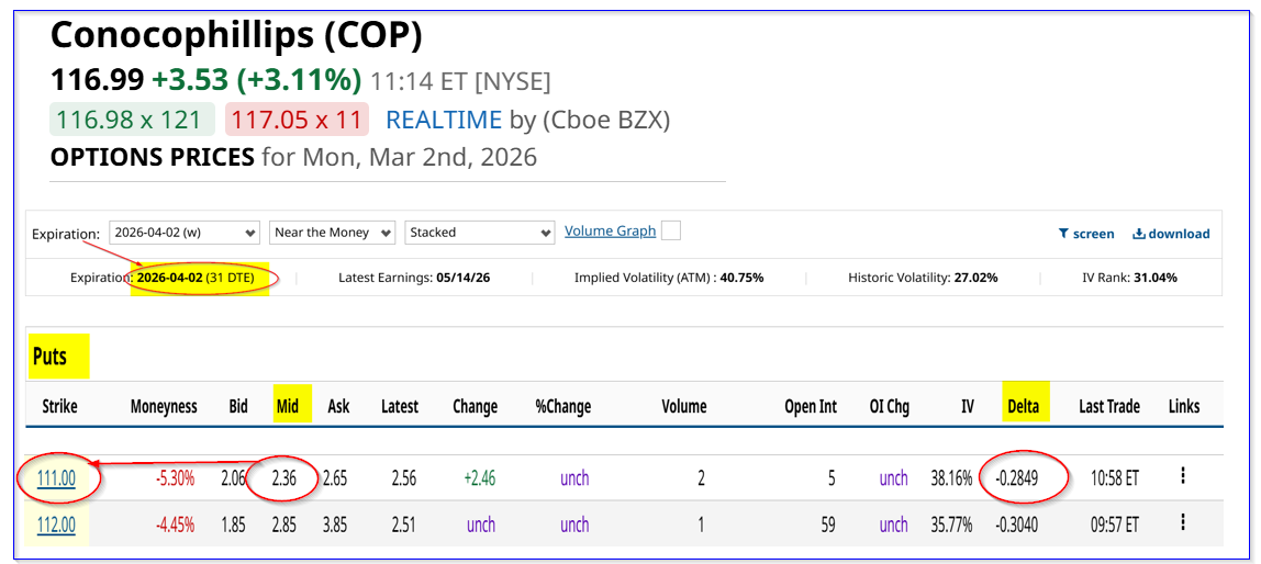 For example, the April 2, 2026, expiry $111.00 strike price put, which is 5.30% lower than today's price (i.e., “out-of-the-money” or OTM), has a $2.36 midpoint premium.