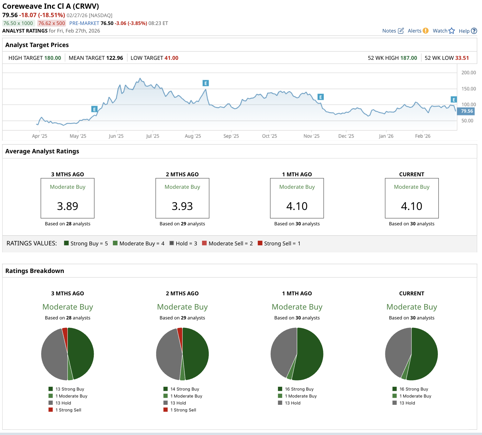 Overall, among the 30 analysts covering the stock, the consensus rating is a "Moderate Buy," with a mean price target of $122.96, implying about 54.5% upside potential from current levels.