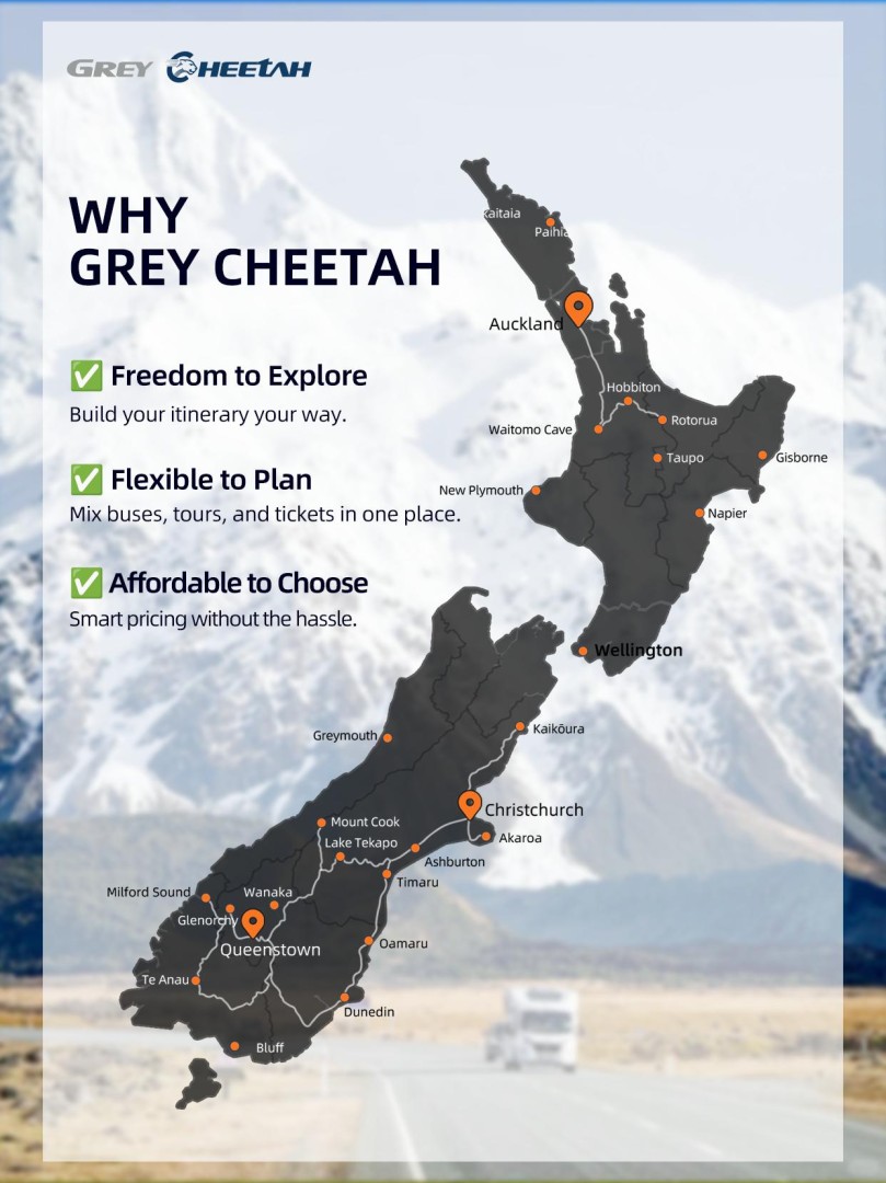 1. Extensive Network & Iconic Destinations: Unlike standard ticket aggregators, Grey Cheetah operates its own fleet to ensure consistent quality. The network connects major hubs across both the North and South Islands with New Zealand’s most iconic attractions. Key routes and destinations include: