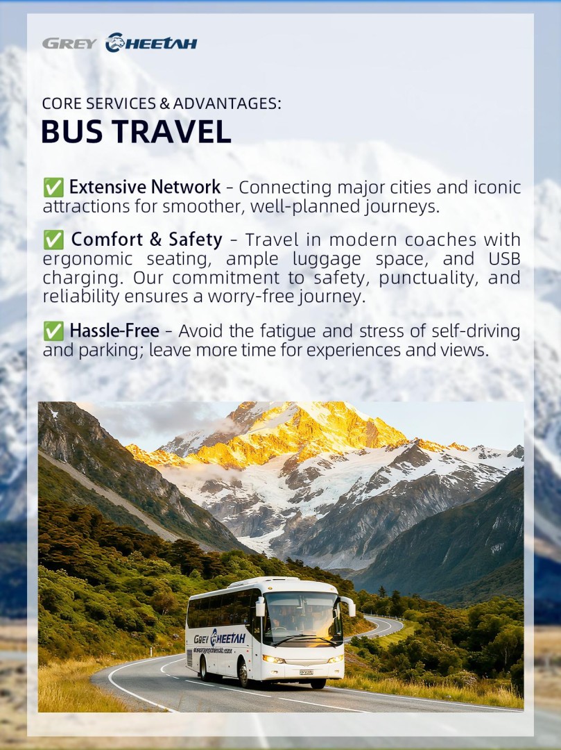 Grey Cheetah Limited is a New Zealand-owned transport and travel technology company. Its mission is to make bus travel simple, flexible, and affordable for independent travellers. Through the Grey Cheetah platform, the company offers scheduled bus services, package tickets, and tours that combine digital convenience with authentic local experiences.