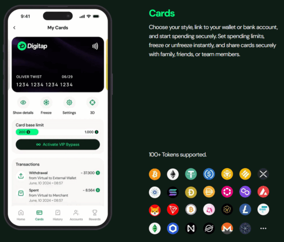 Recently, Digitap announced its partnership with Visa, introducing virtual and physical cards that are designed specifically for bringing a global, multi-currency future. Users can order custom cards from the app and use them for in-person payments at offline stores or to withdraw cash from ATM machines. Virtual cards offer unlimited, daily online spending, best used for anonymous transactions.