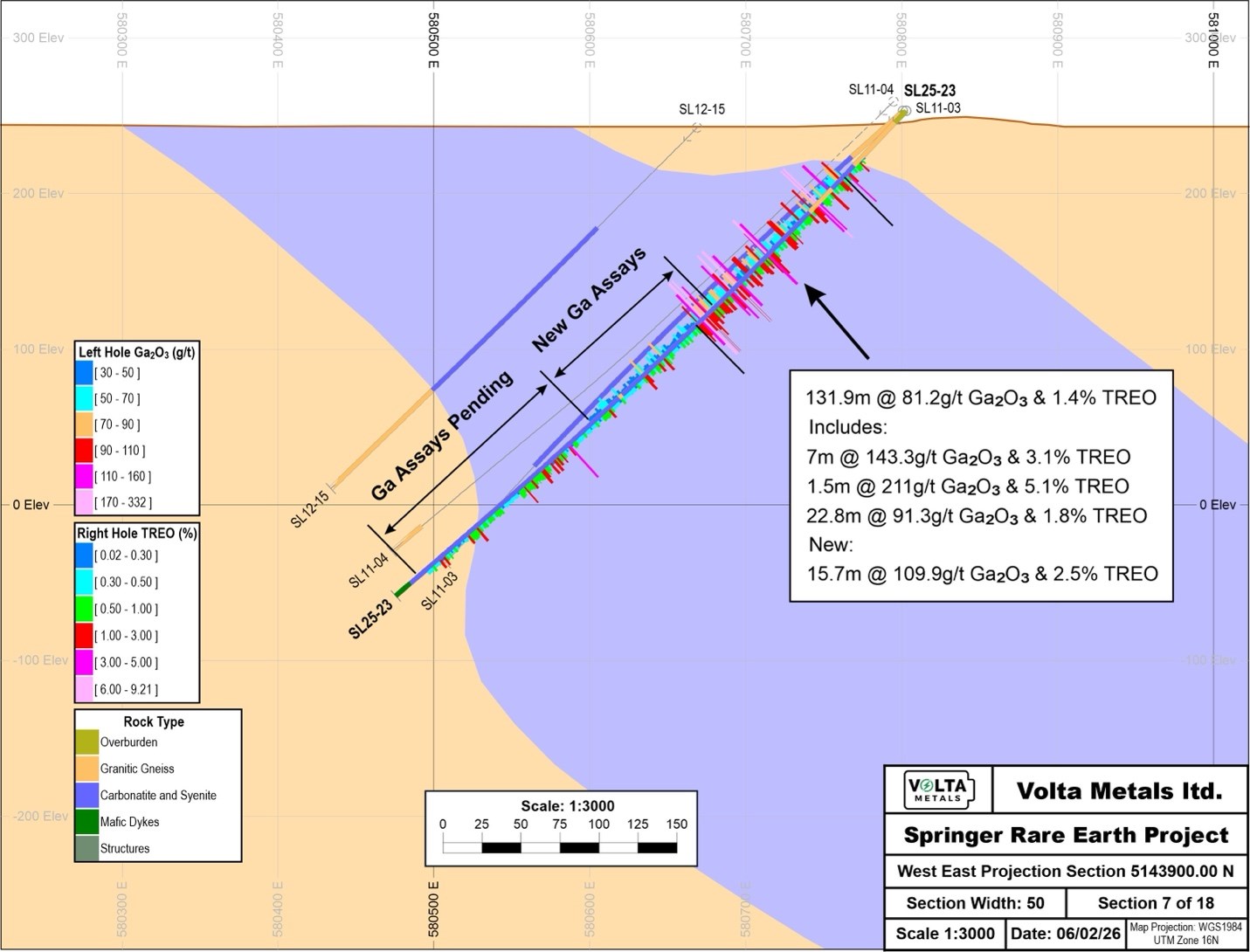 Toronto, Ontario--(Newsfile Corp. - February 11, 2026) - Volta Metals Ltd. (CSE: VLTA) (FSE: D0W) (OTC Pink: VOLMF) ("Volta" or the "Company") reports additional gallium assay results from its Springer Rare Earth Project near Sturgeon Falls, Ontario, Canada. The newly received assays from drill hole SL25-23 confirm the extension of high-grade gallium mineralization over a 131.9m interval grading 81.2 g/t Ga2O3 (Figure 1).